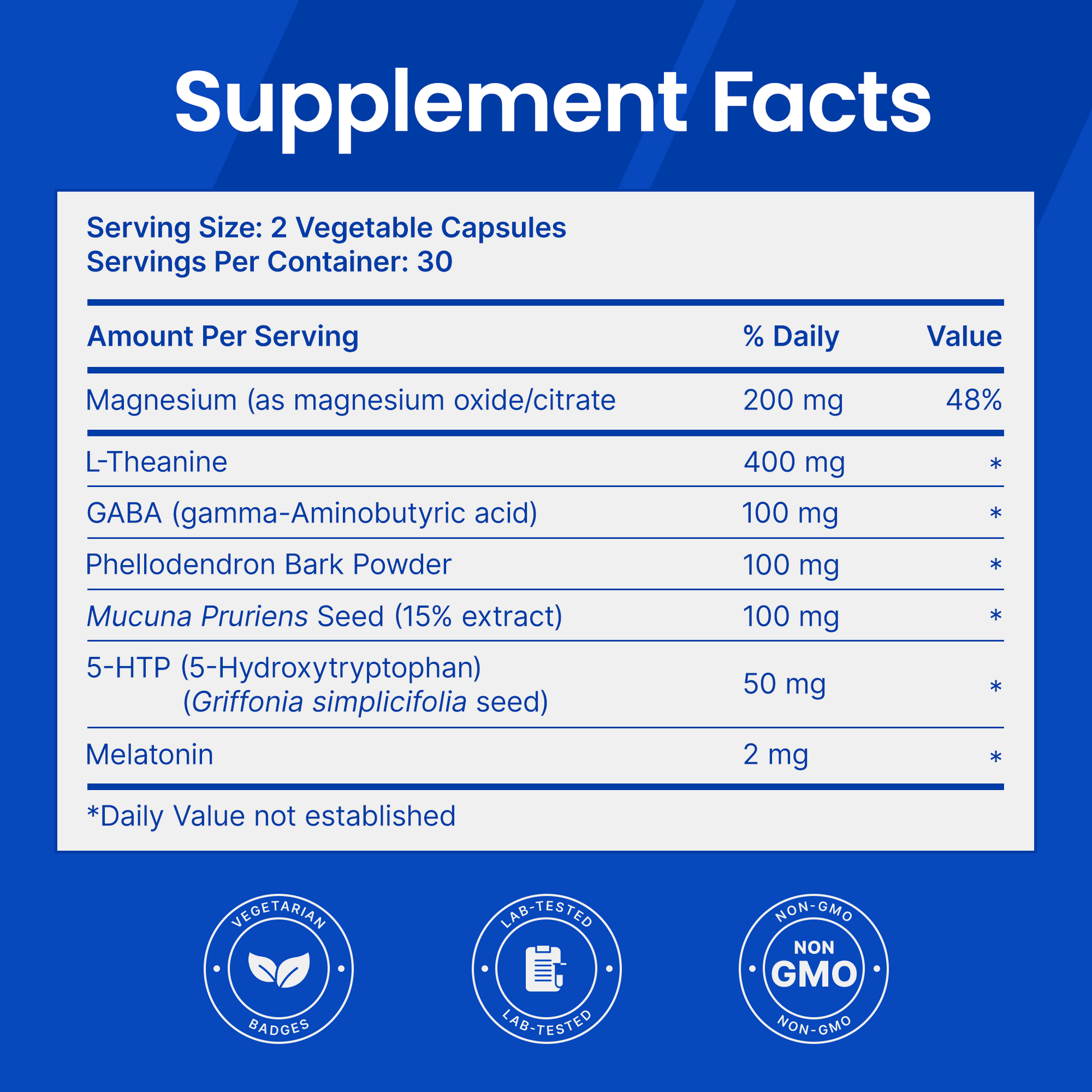 · Complete Stress & Sleep Formula – Features Magnesium Citrate, L-Theanine, GABA, 5-HTP, and Melatonin to promote relaxation, ease daily stress, and support a deep, restful night’s sleep.
